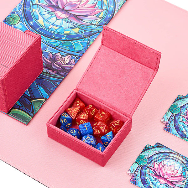 The Radiant 100+ Deck Vault is a premium deck box designed to hold 100+ double-sleeved cards securely. The Stained Glass Collection features high-resolution, original artwork inspired by cathedral windows, offering a unique and striking aesthetic.