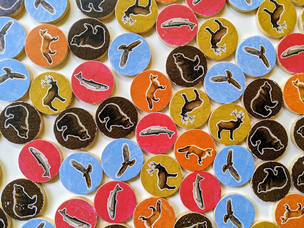 Ideally you can place habitat tiles to create matching terrain that reduces fragmentation and creates wildlife corridors, mostly because you score for the largest area of each type of habitat at game's end, with a bonus if your group is larger than each other player's. At the same time, you want to place wildlife tokens so that you can maximize the number of points scored by them, with the wildlife goals being determined at random by one of the three scoring cards for each type of wildlife. Maybe hawks want to be separate from other hawks, while foxes want lots of different animals surrounding them and bears want to be in pairs. Can you make it happen?