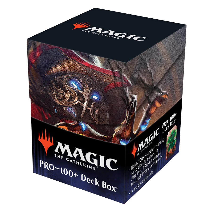 The 100+ Deck Box® card storage container features vibrant, full-color artwork from Magic: The Gathering and includes a deck divider. Made with archival-safe, non-PVC, rigid polypropylene materials, you can store up to 100 double-sleeved cards with confidence. The self-locking lid keeps your cards securely stored when not in use, while also offering easy access. Sized for standard size trading cards.