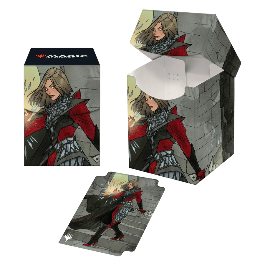 The 100+ Deck Box® card storage container features vibrant, full-color artwork from Magic: The Gathering and includes a deck divider. Made with archival-safe, non-PVC, rigid polypropylene materials, you can store up to 100 double-sleeved cards with confidence. The self-locking lid keeps your cards securely stored when not in use, while also offering easy access. Sized for standard-size trading cards.