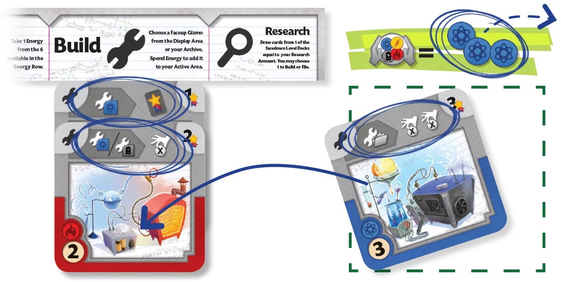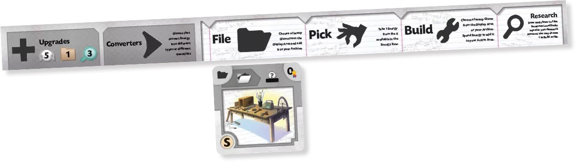 - Research : Draw some cards, and you can then File or Build one of the drawn cards. The rest go to the bottom of their deck.