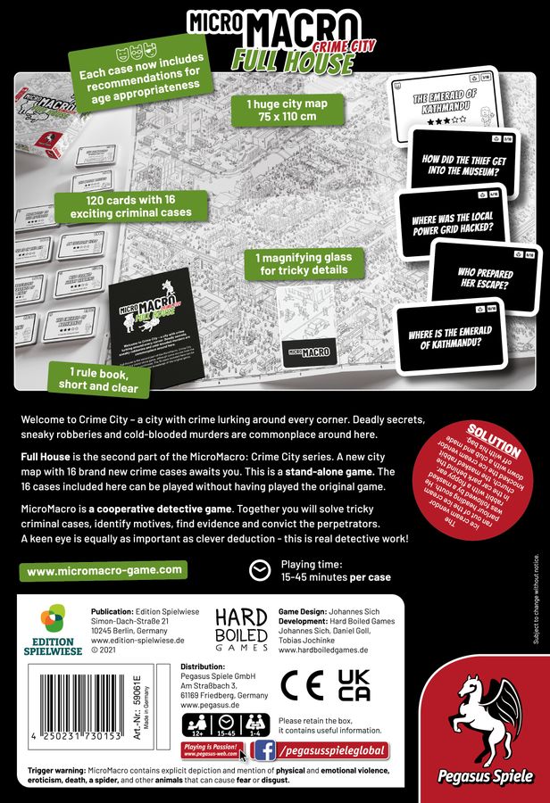 Crimes have taken place all over the city, and you want to figure out exactly what's happened, so you'll need to look closely at the giant city map (75 x 110 cm) to find all the hidden information and trace the trails of those who had it in for their foes.
