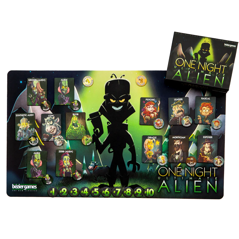 Your village has been invaded by the extraterrestrial! One Night Ultimate Alien is a fast-paced 10 minute game where 3-10 players will each receive a unique role. In the course of only one night players will attempt to gather as much information and cause as much trouble as possible! The following morning, the players will determine who among them is an alien...hopefully. Because all it takes is finding one alien to win!
