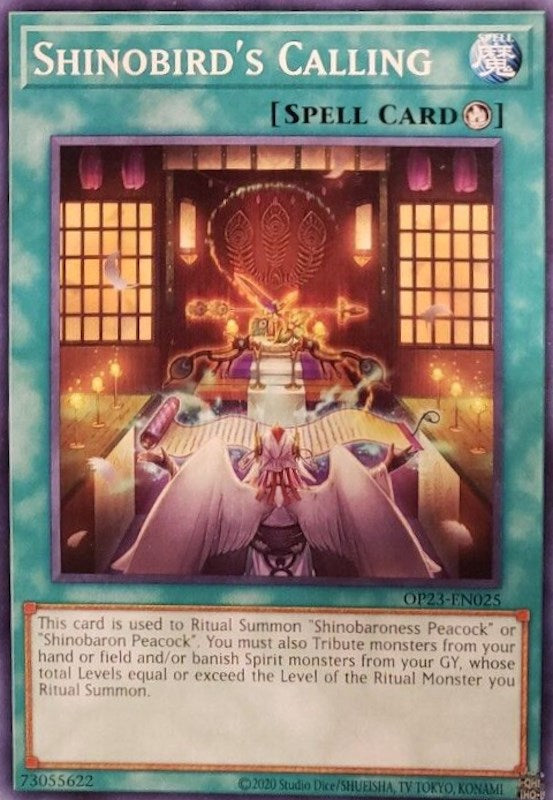 This card is used to Ritual Summon "Shinobaroness Peacock" or "Shinobaron Peacock". You must also Tribute monsters from your hand or field and/or banish Spirit monsters from your Graveyard, whose total Levels equal or exceed the Level of the Ritual Monster you Ritual Summon.